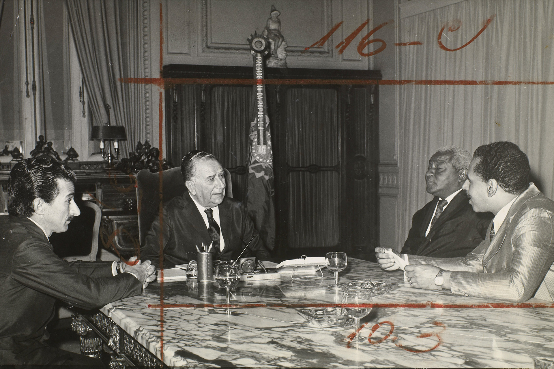 - O presidente da Mangueira, Djalma (Preto) dos Santos, e Bira em reunião com o Presidente Médici, 1972 — Correio da Manhã (JPG)