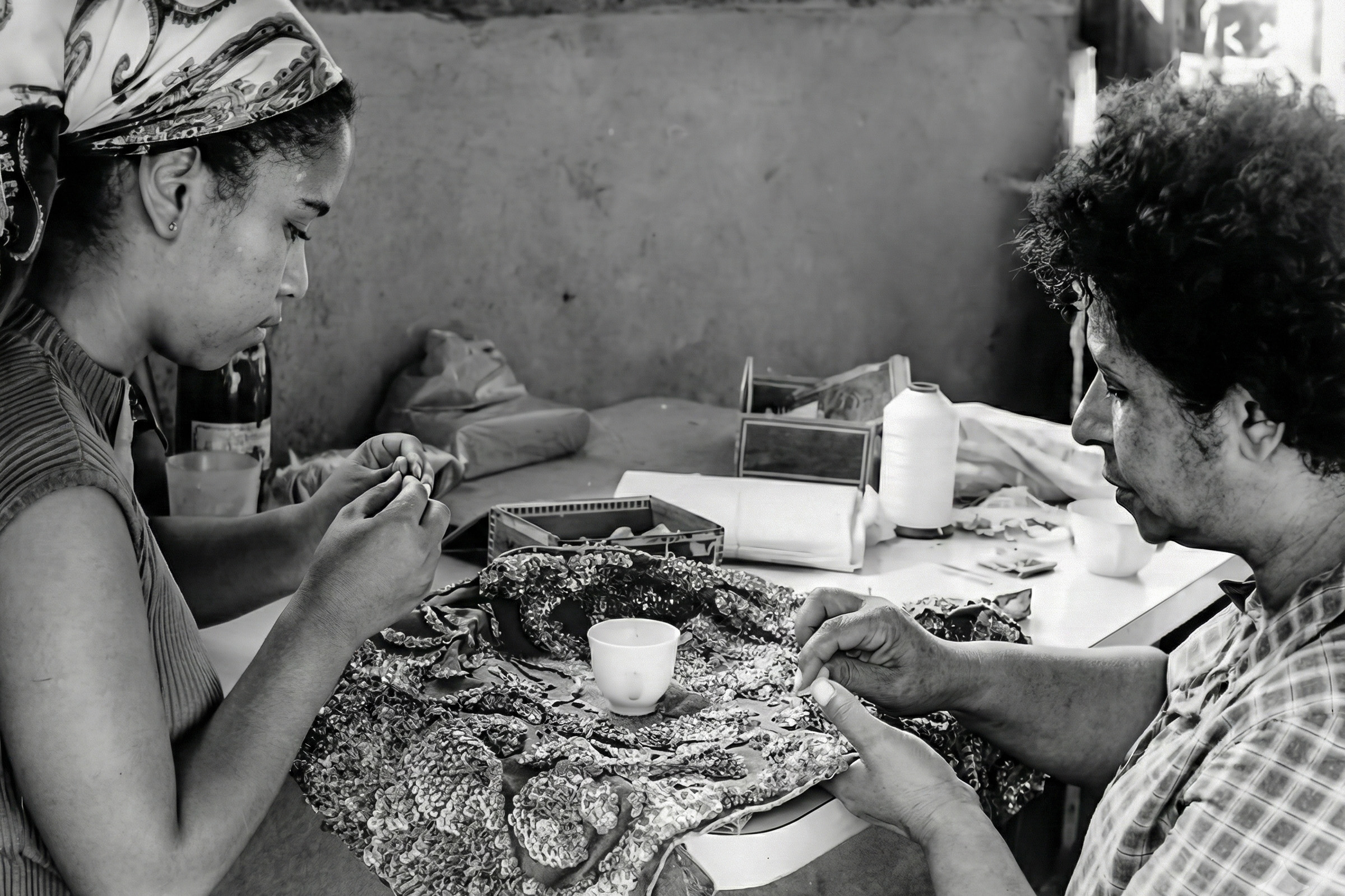 A câmera chegava pouco ao morro. Quando chegava, o jornal imprimia em retícula grossa que virava pó de pontos na página, e o tempo se encarregava do resto — papel amarelava, imagem desbotava, arquivo se perdia. O que sobrou dessas fotografias guardava mais do que a retícula deixava ver: guardava rosto, gesto, momento de uma Mangueira que se fez também longe do holofote, nos bastidores da quadra e no cotidiano da comunidade que ergueu a escola.